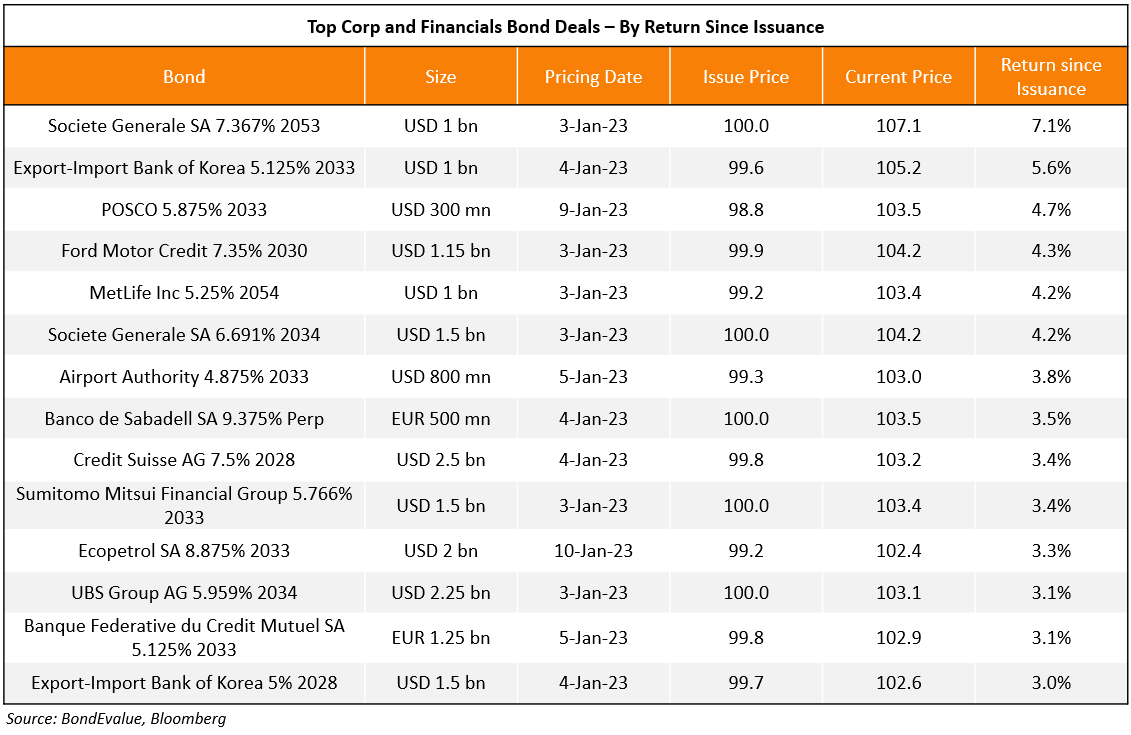 Among the new bond deals from corporates and financials, Socgen’s 2053s have led the tables with returns of 7.1% since issuance, followed by KEXIM’s 2033s at 5.6%, POSCO’s 2033s at 4.7% and Ford’s 2030s at 4.7%.