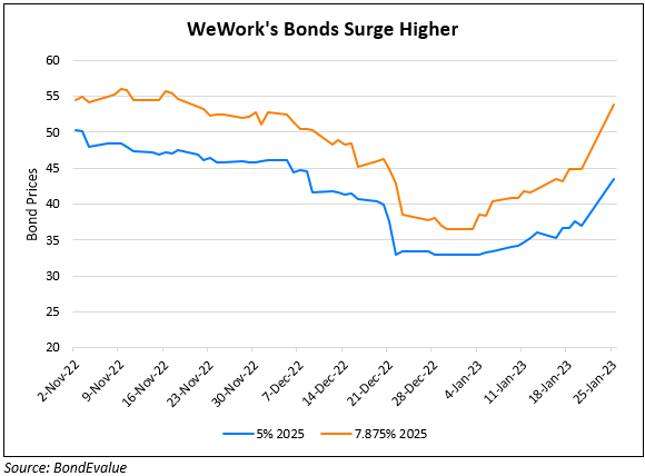 WeWork’s dollar bonds jumped by 6-9 points. The company had recently announced that it planned to cut about 300 roles in order to cut costs in addition to reducing its real estate footprint, amid reducing its cash burn. In November, WeWork announced its exit from 40 US locations and said it expected Q4 revenues of ~$870-890mn and a adjusted EBITDA loss of $65-85mn. The company will announce its Q4 results on February 16.