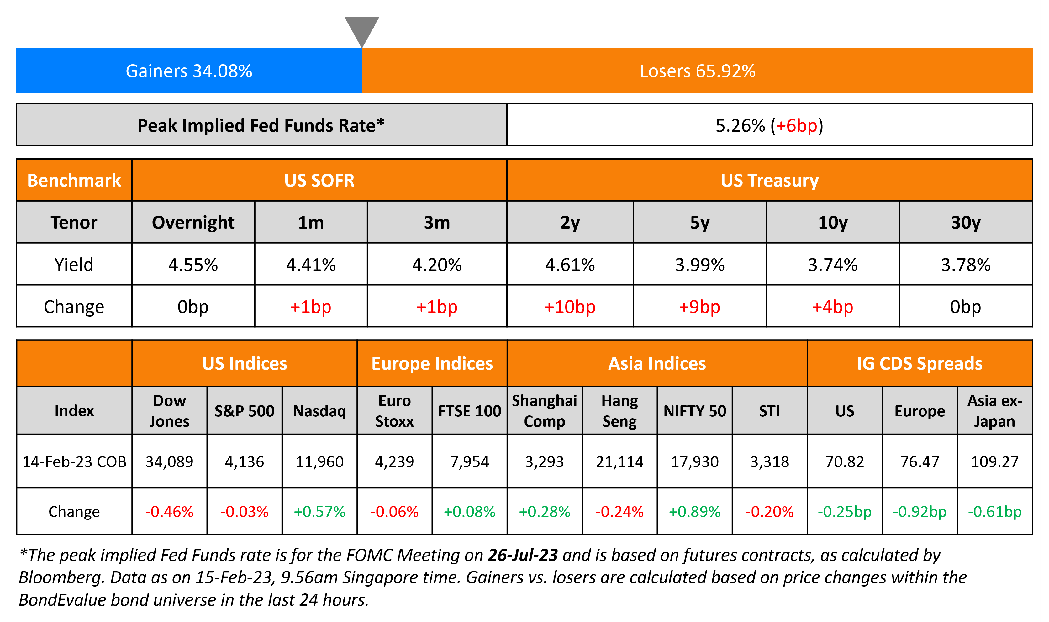 US front-end 2Y and 5Y Treasury yields shot up by 9-10bp after the US CPI report as the curve bear flattened (Term of the Day, explained below) and inverted further. US CPI came at 6.4% for January, above expectations of 6.2% and lower than last month’s 6.5% print. Core CPI came at 5.6%, above the surveyed 5.5% and lower than last month’s 5.7% print. The inflation print showed that while while inflation has slowed down, it is not happening at a fast pace and lends support to the Fed’s stance of on raising rates. The peak Fed funds rate jumped 6bp to 5.26% for the July 2023 meeting. With a 25bp hike in March being priced in, markets are expecting another 25bp in May with a 73% probability. US IG CDS spreads tightened by 0.3bp while HY spreads were 2.5bp wider. Equity indices were mixed with the S&P marginally lower while Nasdaq was up 0.6%.