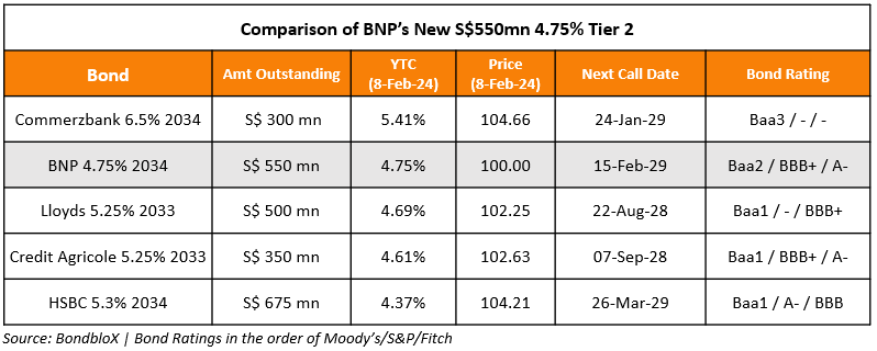 BNP Paribas raised S$550mn via a 10NC5 Tier 2 bond at a yield of 4.75%, 35bp inside initial guidance of 5.1% area. The subordinated bonds are rated Baa2/BBB+/A-. The first call date on the notes occurs on 15 February 2029. The issuer may redeem them bond at par upon occurrence of a capital event, tax deduction event, withholding tax event or gross-up event.