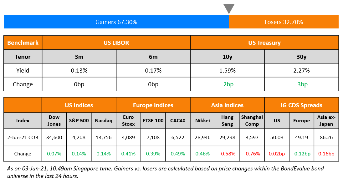 US markets inched up ahead of the weekly unemployment report and May payrolls data. Both S&P and Nasdaq were up 0.1%. The energy sector was up 1.7% followed by real estate, which was up 1.4%. US 10Y Treasury yields were tighter by 2bp at 1.59% and continued to trade in a tight range of 1.55-1.64%. European markets also moved up to near record highs with energy and consumer stocks leading. CAC closed higher by 0.5%, FTSE 0.4% and DAX 0.2%. US IG CDS spreads were flat and HY spreads were 1bp tighter. EU main spreads were 0.1bp tighter and crossover spreads tightened 1.4bp. Asian equities are off to a mixed start with Nikkei and Shanghai up 0.4%, and 0.1% and Hang Seng down 0.3% with Asia ex-Japan CDS spreads widening 0.2bp.