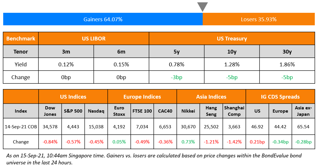 The US Consumer Price Index (CPI) rose 0.3% MoM and 5.3% YoY. This was the slowest increase in six months and was lower than the expectations of 5.4% indicating a easing price pressures and leading to a rally in the longer tenor bonds. Liz Ann Sonders, Charles Schwab chief investment strategist said, “What we need to see to be fundamentally markets supportive is a continued easing in the inflation piece without deterioration in the economic outlook,” adding, “The next couple of weeks, economic data points become even more important to see whether it confirms the the weakness that we saw on the August jobs report or starts to suggest that maybe we’re seeing an improvement.” With the drop in Treasury yields, longer tenor corporate bonds of names like HSBC, ChemChina, Transocean, Occidental rose over 1%.