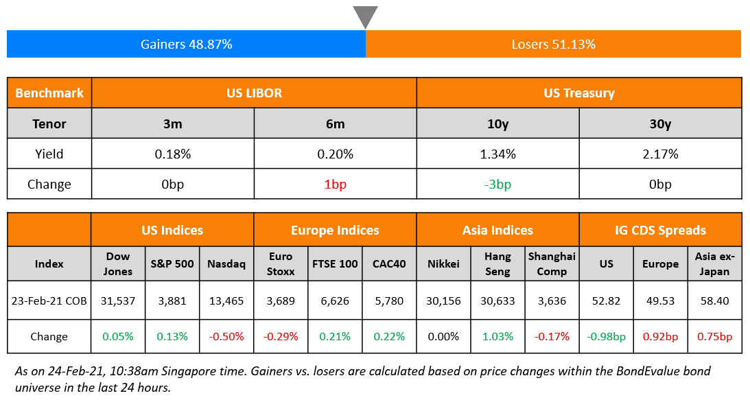 US equity indices started lower with the Nasdaq falling ~4% in early trading before recovering most of the down move towards close. S&P ended 0.1% higher while Nasdaq was 0.5% lower. Tesla closed 2.2% lower and Bitcoin, in which Tesla recently invested $1.5bn, was down 11%. US 10Y Treasury yields eased 3bp to 1.34%. Fed Chair Powell said in his testimony that the Fed is not close to tapering their QE, inflation is soft and that they would continue buying bonds even as the economy recovers. Meanwhile in Europe, FTSE and CAC 40 rose 0.2% and 0.2%, while the DAX and FTSEMIB fell 0.6% and 0.3%. US IG CDS spreads were 1bp tighter and HY was 5.9bp tighter. EU main CDS spreads widened 0.9bp and crossover spreads widened 4.7bp. Asian equity markets have opened mixed today while Asia ex-Japan CDS spreads are 0.7bp wider with seven new dollar deals this morning, the busiest day at the Asian primary markets in three weeks.