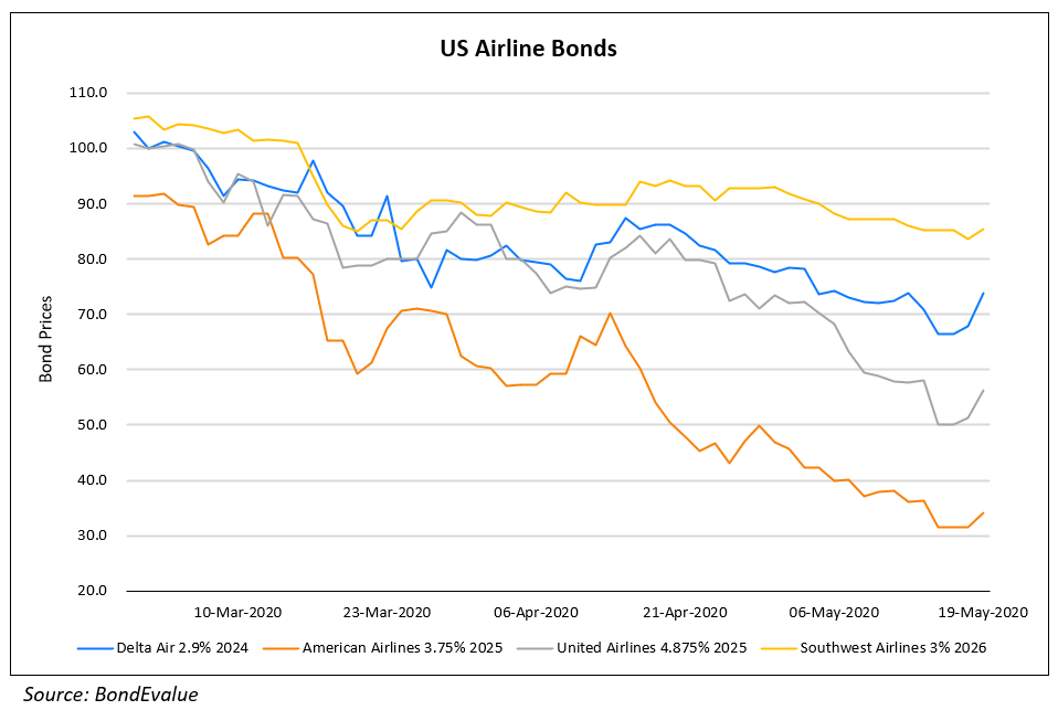 Helping spark some investor enthusiasm, the Transportation Security Administration’s (TSA) latest data showed that for the week ended Saturday, an average of 205,010 travelers per day went through TSA checkpoints, according to a MarketWatch analysis of TSA data. While that’s down 91.5% from a year ago, it marked the fourth-straight week that the daily average increased and the year-over-year decline decreased. The rally in the sector comes with many stocks bouncing off multi year lows, and as part of a surge in the broader stock market. Among the ETF’s most active components, shares of American Airlines Group Inc. jumped 9.2%, after closing Friday at a record low; Delta Air Lines charged up 13.9%, after losing 15.5% last week amid a 5-day losing streak, to close Friday at the lowest price since August 2018; and United Airlines Holdings Inc. ran up 21.1%, the biggest one-day gain in two months, after last week’s 21.7% plunge last week ended Friday with the lowest close since December 2012. The bonds for these airlines moved as per the chart below.