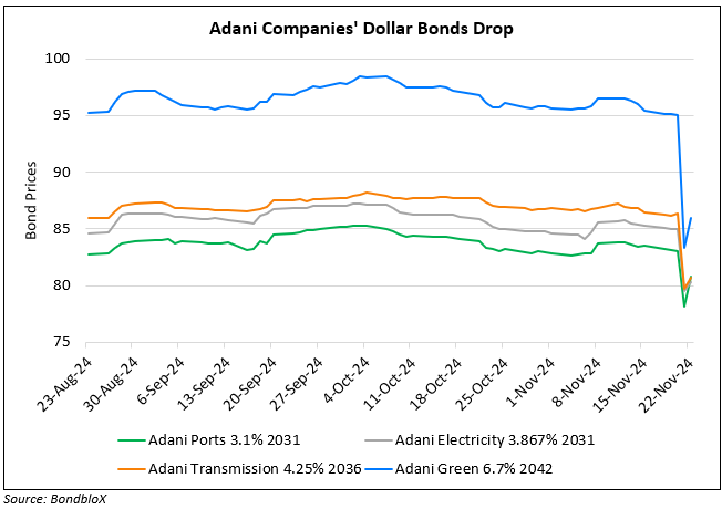 Adani companies’ dollar bonds dropped sharply yesterday across the curve after an indictment was announced against a number of senior executives by the US Attorney’s Office, Eastern District of New York. Adani Group rejected the charges made by US prosecutors stating that they were “baseless”, adding that have always upheld and stayed “committed to maintaining the highest standards of governance, transparency and regulatory compliance across all jurisdictions” of its operations.
