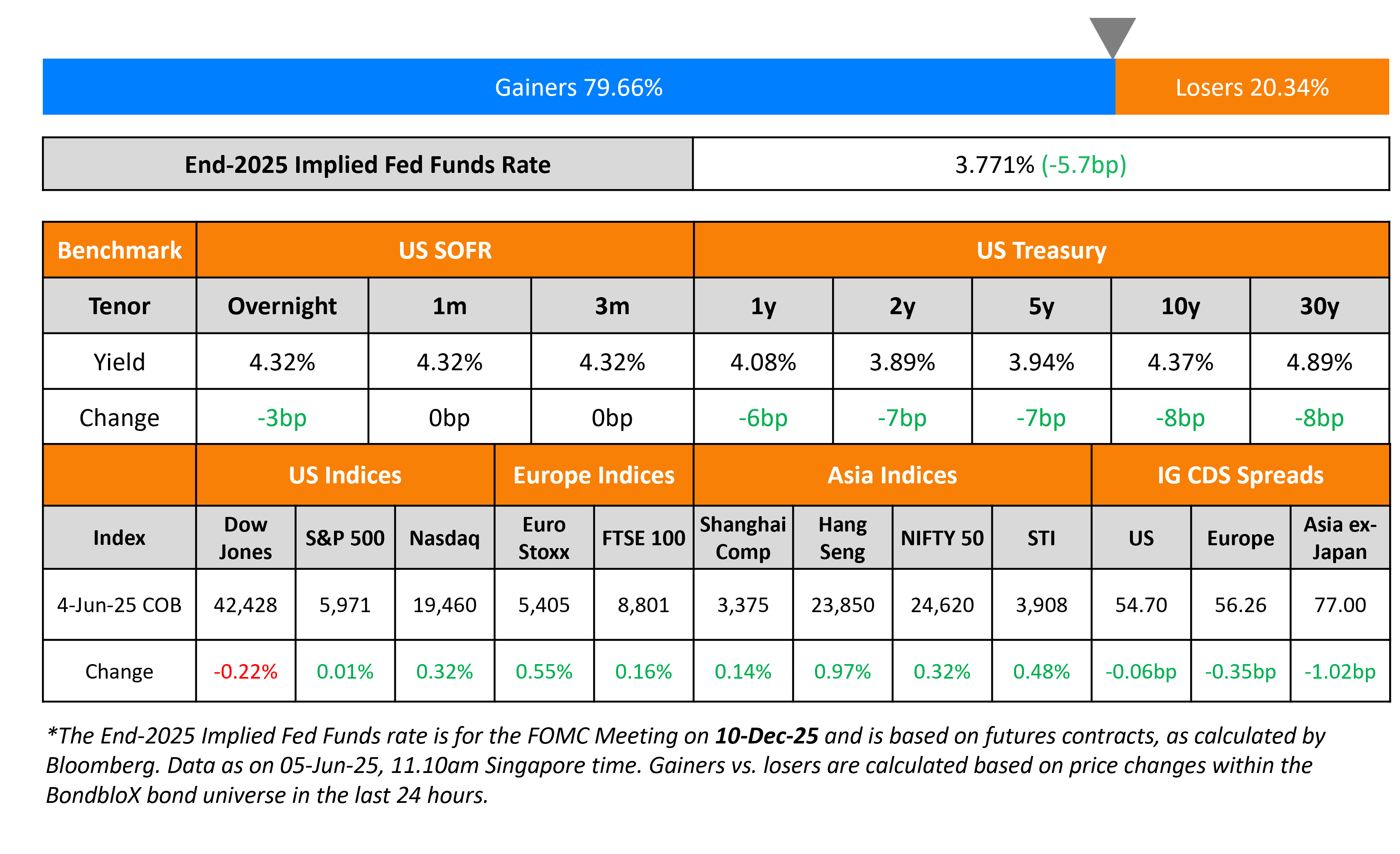 US Treasury yields fell by ~7bp across the curve. ADP Nonfarm Employment Change for May came-in at 37k vs. expectations of 111k, the lowest reading since February 2022. The ISM Services PMI for May came-in at 49.9 vs. expectations of 52, marking its first contractionary reading since July 2024. Minneapolis Fed President Neel Kashkari said that the Fed is well positioned to wait and see how tariff policies impact the economy before adjusting interest rates. US President Donald Trump said in a late-night social media post that Chinese leader Xi Jinping was very tough to make a deal with, raising concerns about the current tariff status between the two nations.