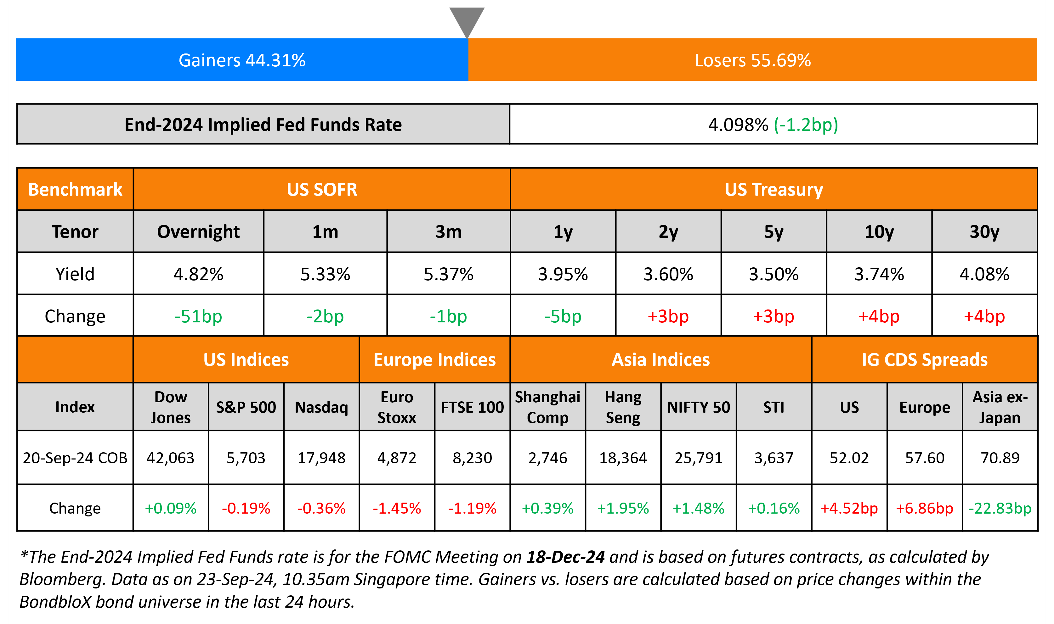 US Treasury yields inched up last Friday, by about 3-4bp across the curve. This week, the Fed would be looking forward to a host of economic data that will be released, to validate its 50bp rate cut last week. These include the August preliminary figures for the S&P Manufacturing and Services PMI, Q3 GDP growth number and Core PCE figures for Q2. In addition to this, investors will also be listening closely to remarks by Fed Governors and regional Fed Presidents who are set to speak at various events. According to Bank of America Corp’s strategist Michael Harnett, last week’s cut has increased the risk of a bubble in equities, making bonds and gold an attractive hedge in investors’ portfolios. US IG and HY CDS widened by 4.5bp and 8.9bp respectively. US equity markets ended lower with S&P and Nasdaq down by 0.2% and 0.4% respectively.