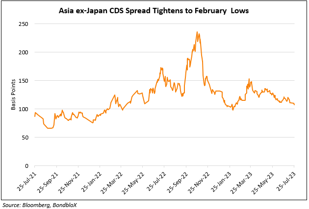 European equity indices were near flat. European main CDS spreads were wider by 0.1bp and Crossover CDS widened 2.5bp. Asia ex-Japan CDS spreads tightened sharply by 4bp to its lowest level since February, helped by the Chinese Politburo’s stance to ease conditions to support the nation’s recovery path and help the property sector. Asian equity markets have opened lower this morning.