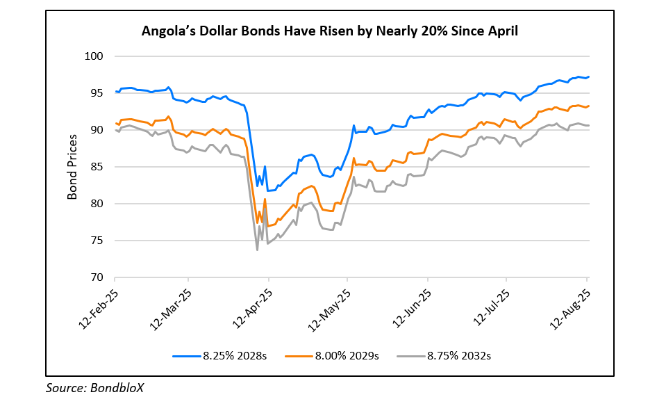 Angola’s dollar bonds have recovered from their recent lows in April, and its 8.00% 2029s have rallied by about 21% in the last 4 months. It is currently trading at 93.25, yielding 9.97%.