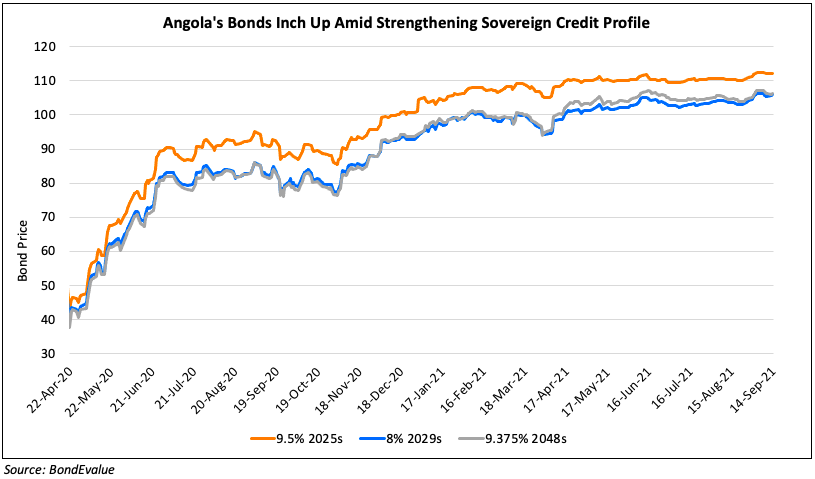 Angola’s 9.5% 2025s, 8% 2029s and 9.375% 2048s were up 0.11, 0.17 and 0.21 to trade at 112.24, 105.94 and 106.3 respectively. The bonds have gained ~200% in the last 18 months from the pandemic lows and have returned ~10% YTD as its credit metrics have strengthened.