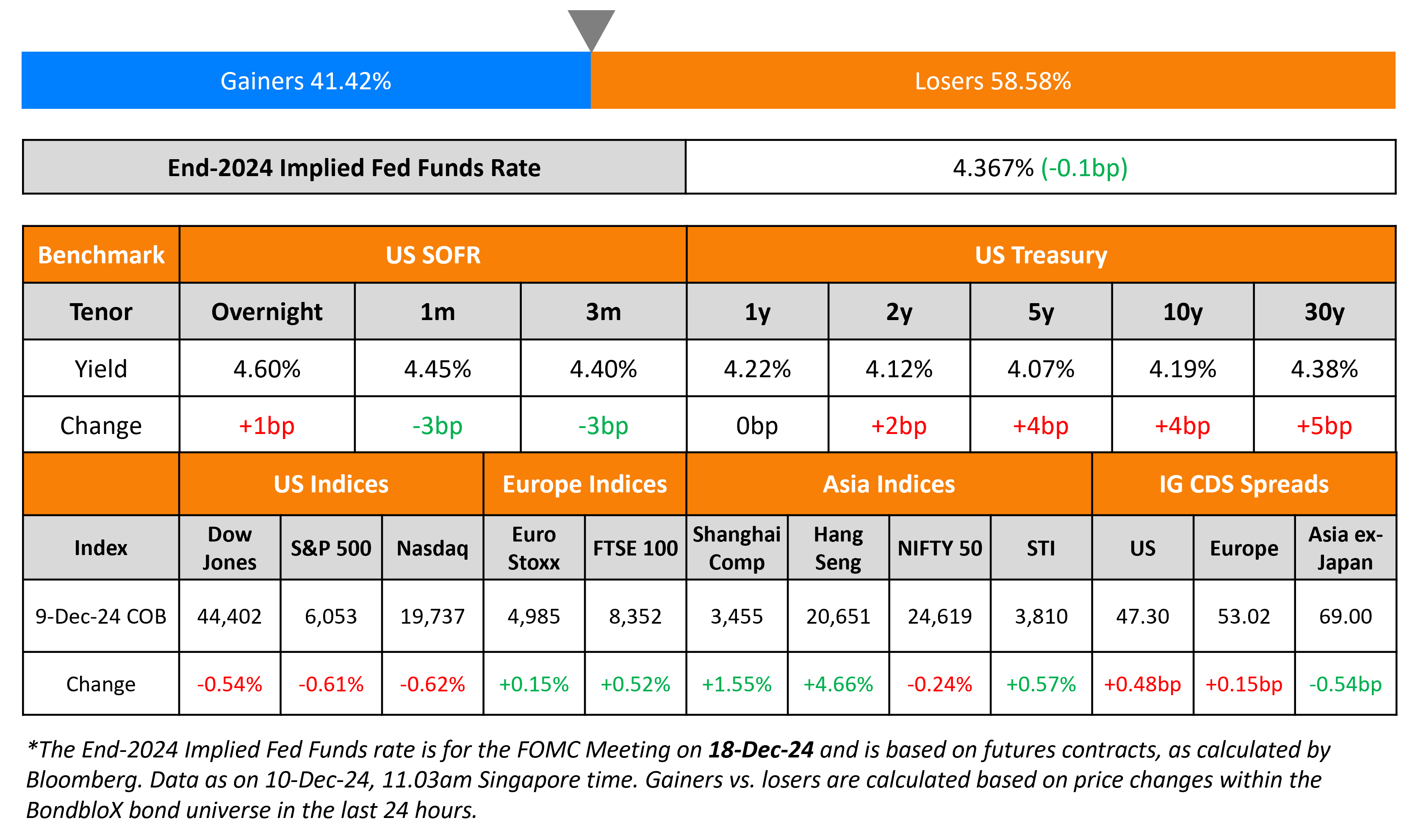 US Treasury yields recovered the drop seen after the jobs report, rising by ~4bp on Monday. Markets continue to price-in an 85% probability of a 25bp rate cut by the Fed next week. The US inflation report is due to come out tomorrow with analysts noting that it could impact the path of rates beginning with the January FOMC meeting.