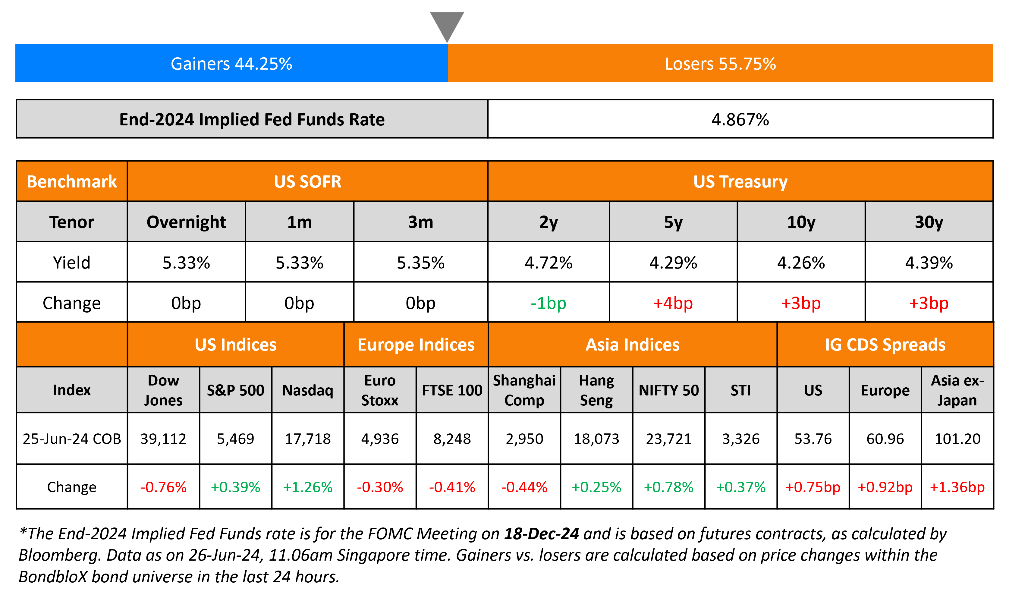 Treasury yields were marginally higher across the curve. The US Conference Board Consumer Sentiment Index dipped to 100.4 in June vs. 101.3 in May, albeit slightly higher than the surveyed 100.0. Fed Governor Michelle Bowman said that the Fed is “not yet at the point where it is appropriate to lower the policy rate”. She added that she does not expect any rate cuts this year. Separately, another Fed Governor Lisa Cook said that it would be appropriate to cut rates at some point, while the timing would be data dependent. Looking at equity markets, S&P and Nasdaq were up 0.4% and 1.3%, respectively. US IG spreads were 0.8bp wider while HY CDS spreads widened by 0.7bp.