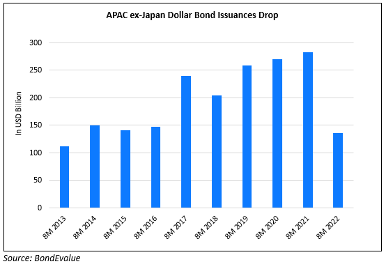 Issuance volumes from the APAC ex-Japan region during the first eight months of 2022 are at its lowest since 2013. Issuance volumes stood at $136.4bn during the period. With respect to quarterly volumes, while the third quarter is not yet over, the region is on track for its lowest Q3 volumes since 2011. Deal volumes currently stand at $16.24bn for Q3. Chinese property developers typically contribute to a large chunk of deals from the region. However, due to the sector’s crisis, private developers have barely tapped primary markets. Besides, the continuous rise in interest rates thanks to high inflation and hawkish central banks have seen volatility pick-up in financial markets, further depressing issuance volumes in primary markets from APAC ex-Japan.