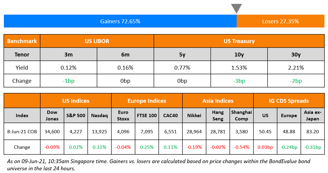 US markets gained marginally to remain within point blank range of the all-time highs. S&P remained largely unchanged and Nasdaq gained 0.3%. Consumer Discretionary and Energy sectors led the gains, up 1% and 0.9% respectively. The US Commerce Department data revealed that the US trade deficit narrowed for the first time in April 2021. US 10Y Treasury yields dipped by 3bp to 1.53%, their lowest in the month. The global economy is expected to expand 5.6% in 2021, the strongest in 80 years, according to the World Bank. European markets had a mixed day with DAX lower by 0.2% while FTSE and CAC were higher by 0.3% and 0.1% respectively. US IG spreads were largely flat and HY CDS tightened 0.3bp. EU main and crossover CDS also tightened marginally by 0.2bp and 1.2bp respectively. China’s producer inflation data for May came in higher than expected at 9% vs. expectations of 8.5% while CPI rose 1.3% vs. expectations of 1.6%. Asian markets have a mixed opening. Nikkei was down 0.3% while Shanghai and HSI were up 0.4% and 0.1%. Asia ex-Japan CDS spreads tightened 0.3bp.
