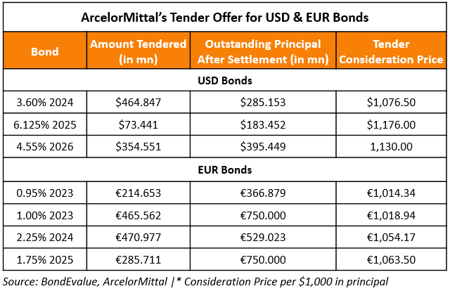 ArcelorMittal announced results for its USD and EUR bond tender offer launched earlier this month (table above)