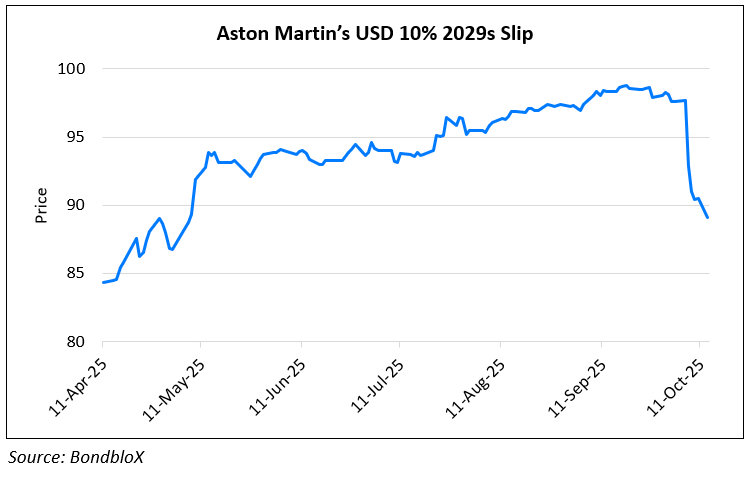Aston Martin Lagonda, the parent holding company was downgraded by a notch to CCC+ from B- by S&P. The downgrade reflects expectations of heavy cash burn and weak cash flow generation prospects in 2025. According to S&P, in 2025, the company’s revenue is expected to fall about 10–11% due to weaker demand in North America and Asia-Pacific, with EBITDA losses estimated at £50–75mn ($66.8-100.2mn) and negative free cash flow of £380–400mn ($507.5-534.2mn). Despite large outflows, Aston Martin’s liquidity is viewed as adequate, with £124mn ($165.6mn) in cash as of end-June 2025, £103mn ($137.6mn) of undrawn RCF headroom, £53mn ($70.8mn) in shareholder support raised during the year, and £110mn ($146.9mn) proceeds from the sale of AML’s Formula 1 stake. S&P expects no covenant breaches and that the company can meet funding needs over the next 12 months. A turnaround in 2026 hinges on successful Valhalla deliveries, expected to lift revenue to ~£1.8bn ($2.4bn) and EBIT to ~£100mn ($133.5mn) with limited cash burn. Its 10% 2029s plunged by almost 7- 8 points over the last week.