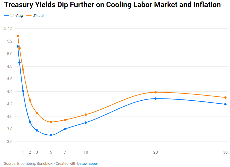 August 2024 was yet another strong month for bond investors with 93% of dollar bonds ending higher (price returns ex-coupons), adding to July’s performance where 91% of dollar bonds ended higher. Both, Investment Grade (IG) bonds and High Yield (HY) dollar bonds witnessed solid performances as jobs and inflation cooled down while the broad economy held steady, alongside expectations of 100bp in rate cuts by the Fed. The Treasury curve shifted further lower through the month. 95% of IG bonds and 85% of HY bonds closed in the green during the month.