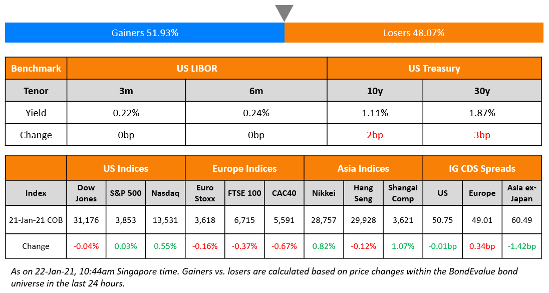 S&P ended the day flat while Nasdaq was up 0.6% with Apple up 3.7% and Facebook up 2%. US 10Y Treasury yields were 2bp wider. US jobless claims for the prior week improved, printing at 900k, a fall of 26k. US Philly Fed Manufacturing exceeded expectations with a 17.4 point jump to 26.5. Also, US House speaker Pelosi said they will be ‘completely ready’ to pass Biden’s $1.9tn coronavirus relief bill by February 1. The ECB kept its policy rates and stimulus unchanged. FTSE, DAX and CAC fell 0.4%, 0.1% and 0.7%. US IG CDS spreads were flat and HY was 1.7bp wider. EU main and crossover CDS spreads widened 0.3bp and 2.9bp respectively. Asia ex-Japan CDS spreads tightened 1.4bp and Asian equities are off to another positive start, up ~0.7% today.