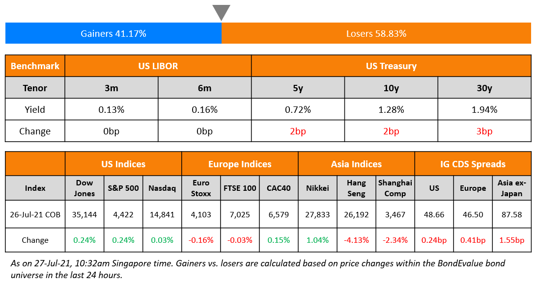 Fujian Yango Group raised $250mn via a 2 year 5 month bond at a yield of 12.5%. The bonds have expected ratings of B-. Yango (Cayman) Investment is the issuer and Fujian Yango Group is the guarantor. Proceeds will be used for debt refinancing, including a tender offer for its outstanding $285mn 12.5% 2021s at par plus accrued and unpaid interest. The deadline is August 2, 2021.