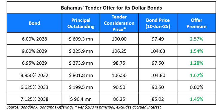 Bahamas launched a tender offer to purchase six of its outstanding dollar bonds for cash. The tender offer is not conditional upon any minimum participation of any series of the notes. The offer is conditional upon a concurrent dollar bond issuance for which Bahamas has hired bankers. The maximum amount to be paid on the outstanding notes will be determined by the government, wherein, it can accept all or a portion of the notes. Holders whose notes are accepted for purchase in the offer will also receive any accrued and unpaid interest. Details of the respective notes under the tender offer are given in the table.