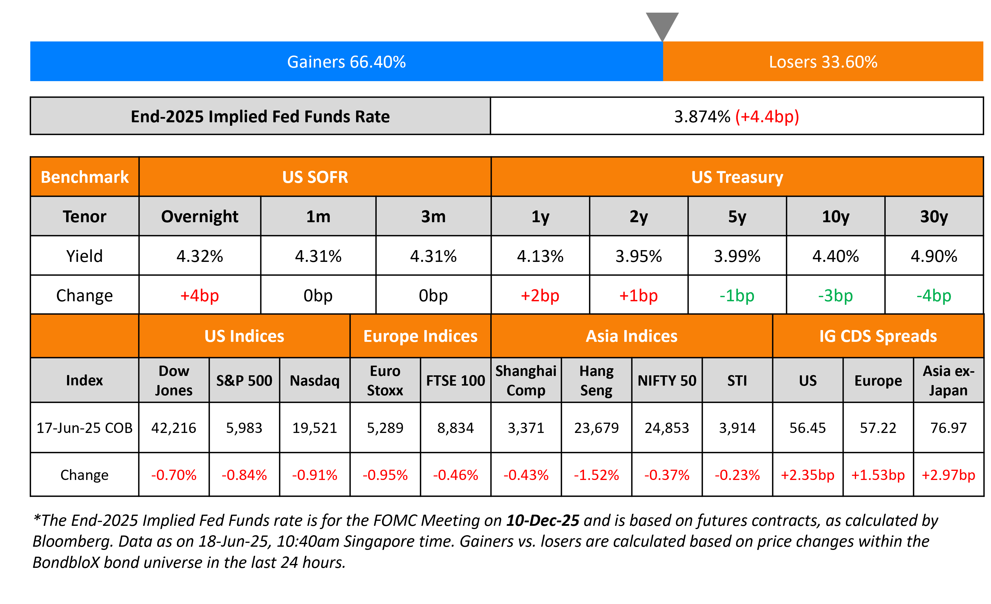 US Treasury yields fell slightly in the longer end of the curve, with the 2Y10Y spread flattening by 4bp. Retail Advance Sales for May declined by 0.9% MoM, vs. expectations of negative 0.6%. The prior reading of 0.1% for April has been revised to -0.1%. This is the biggest pullback in the last four months, showing weakness in consumer sentiment amid tariff uncertainty. US President Donald Trump calls for Iran’s “unconditional surrender” as the Israel-Iran war enters the sixth day. Trump also iterated that his early departure from the G7 summit had nothing to with the ongoing war.