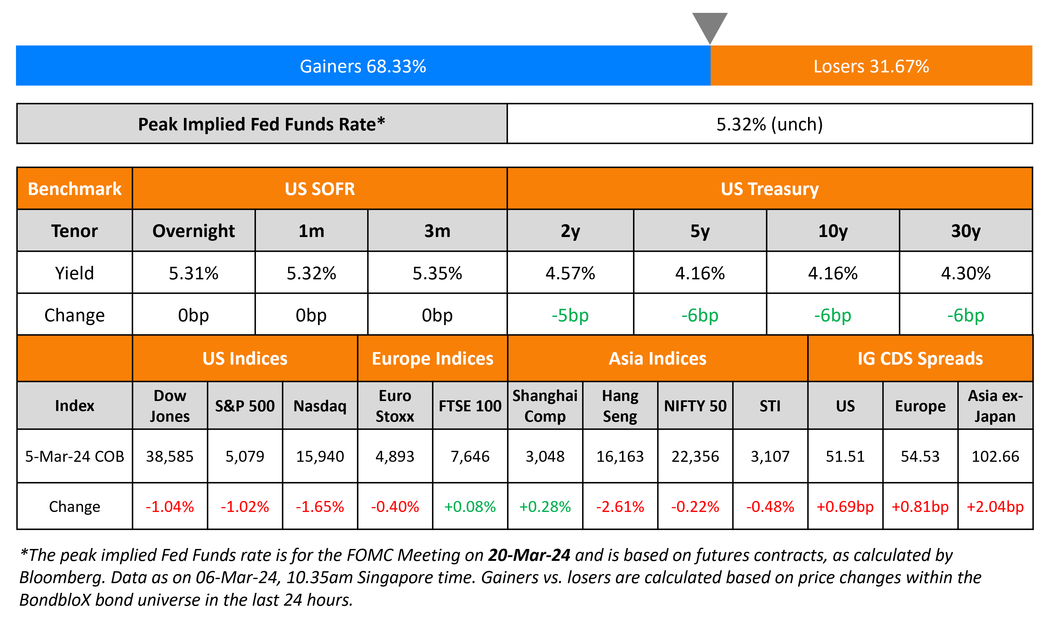 US Treasury yields fell by 5-6bp across the curve after a softer than expected ISM Services print. US ISM Services PMI came at 52.6 for February, lower than expectations of 53 and the prior month’s 53.4. The Price Paid component fell to 58.6 from 64 with analysts suggesting it may indicate a slowdown in inflation. The Employment component fell to 48 from 50.5 while the New Orders component jumped to 56.1 from 55. Looking at credit markets, US IG CDS spreads widened 0.7bp and HY CDS spreads were 4bp wider. Equity markets closed lower with the S&P and Nasdaq down 1% and 1.7% respectively.