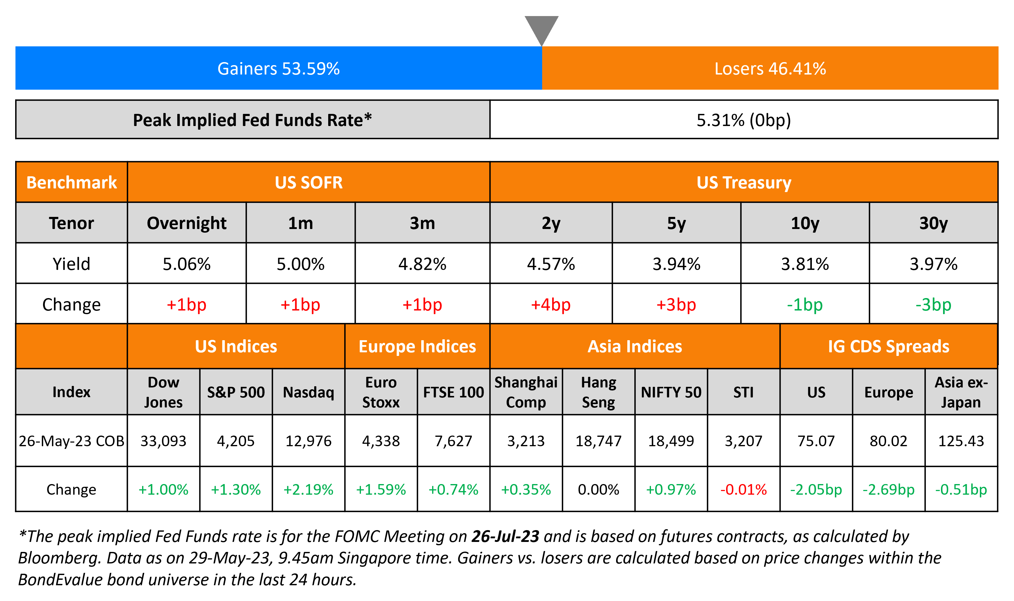 Separately, in terms of economic data, US Core PCE rose by 4.7% in April, higher than the estimate and prior month’s 4.6%. Economic strength continues to be seen with Durable Good Orders rising by 1.1% vs. estimates of a 1.1% drop. Markets now expect a 62% chance of a 25bp rate hike in June as per CME probabilities. This compares to just about an 8% chance of a rate hike a month ago. The peak Fed Funds Rate remains unchanged at 5.31% for July. Equity indices closed higher on the back of debt ceiling optimism with the S&P and Nasdaq higher by 1.3% and 2.2% respectively. US IG CDS spreads tightened by 2.1bp and HY CDS spreads tightened by 9.4bp.