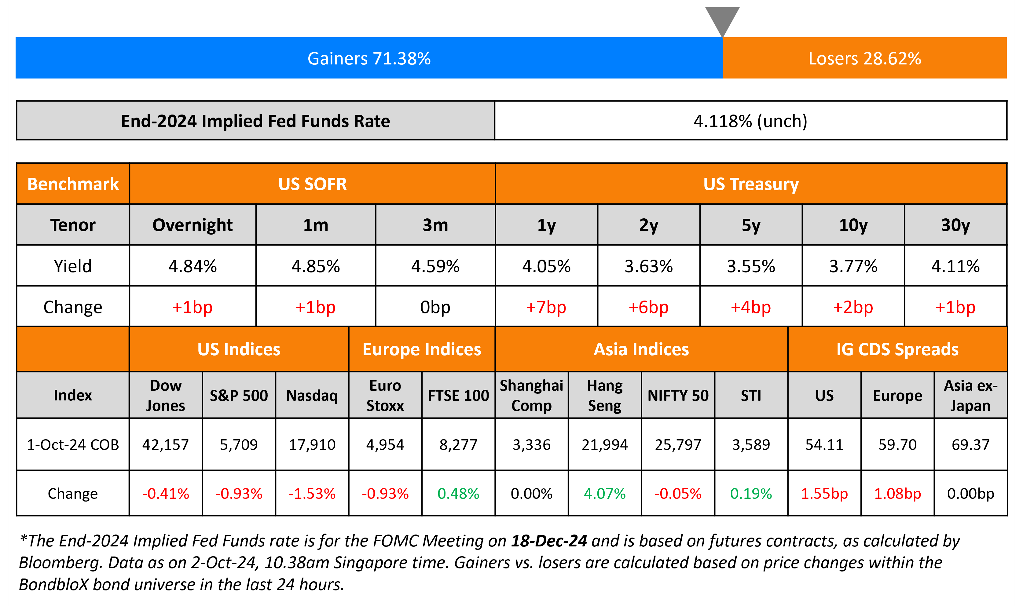 US Treasuries rallied by 3-5bp across the curve as the conflict in the Middle East escalated, boosting demand for safe haven assets. ISM Manufacturing PMI for September remained unchanged at 47.2 compared to August’s number, but came in lower than estimates of 47.5. The JOLTs job openings for August rose by 329k to 8.04mn, stronger vs. market expectations of 7.65mn. The JOLTS report also showed layoffs declining. US IG CDS widened by 1.6bp, while HY CDS tightened by 32bp. US equity markets ended lower, with both S&P and Nasdaq down by 0.9% and 1.5% respectively.