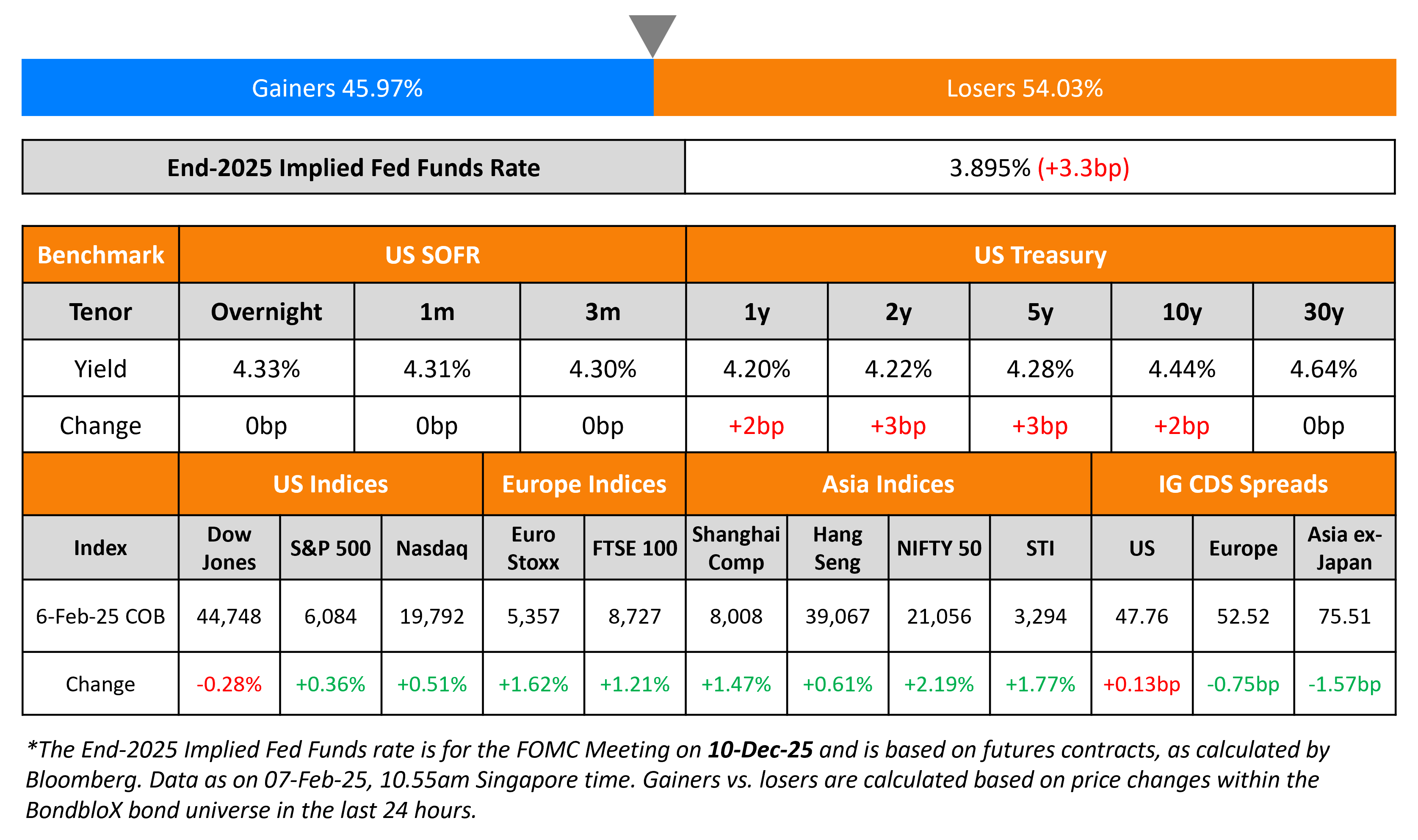 US equity markets saw the S&P and Nasdaq move higher by 0.4-0.5%. Looking at credit markets, US IG and HY CDS spreads widened by 0.1bp and 0.8bp respectively. European equity markets were higher. The iTraxx Main and and Crossover CDS spreads tightened by 0.8bp and 2.7bp respectively. The Bank of England (BoE) cut its policy rates to 4.50% from 4.75%, in-line with expectations. Asian equity markets have opened broadly mixed. Asia ex-Japan CDS spreads were tighter by 1.6bp.