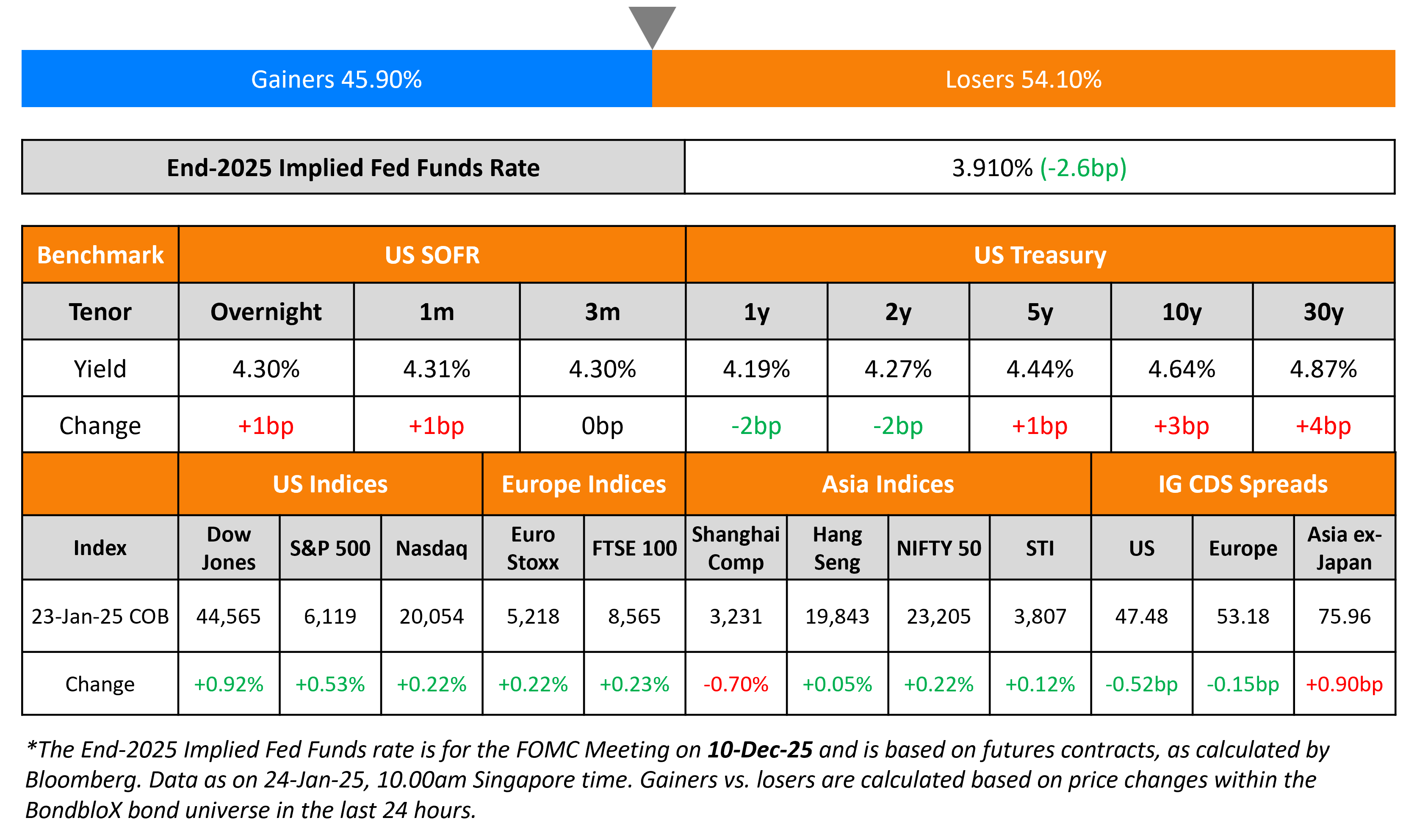 The US Treasury curve steepened marginally with the 2Y yield down 2bp while the 10Y yield rose 3bp. In his WEF Davos address, US President Donald Trump indicated potentially imposing tariffs on the EU, in addition to Mexico, Canada and China. Separately, US initial jobless claims for the previous week stood at 223k, slightly higher than expectations of 220k.