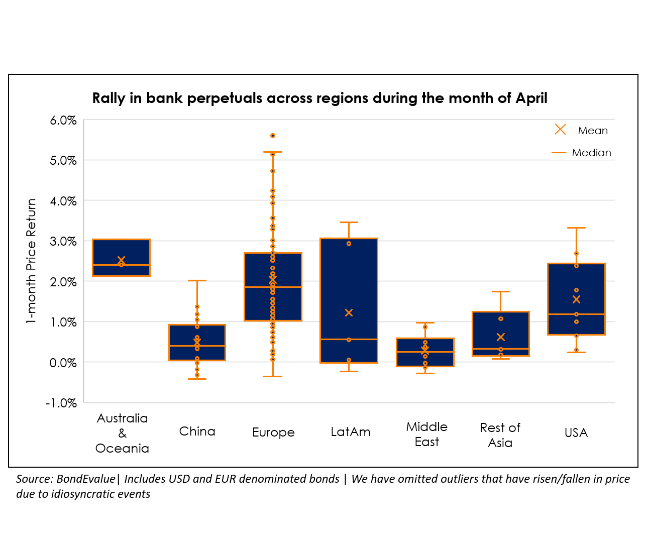 60% of bonds in the BEV universe delivered a positive price return during April. Of these, a group that stood out were bank perpetual bonds. Below is a boxplot that shows the 1-month price return (ex-coupon) of bank perpetuals (in the BEV universe) across regions.