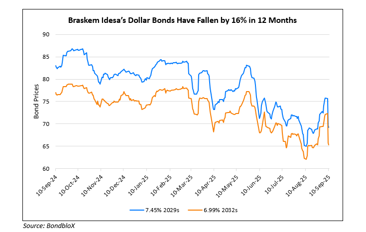Braskem Idesa was downgraded by Fitch to CCC+ from B+ (three notches) and by S&P to CCC from B- (two notches). Both agencies cited heightened restructuring risks following the company’s appointment of Lazard and other advisers to evaluate financial alternatives. They also maintained a negative outlook on the company. Fitch expects Polyethylene prices to remain lower than expected in 2025 and 2026, in turn pushing net leverage above 15x in 2025. Fitch also expects cash to have fallen from the $100mn level reported on 30 June 2025. S&P similarly noted that liquidity is already tight against the company’s current structure, with limited operating cash flow and heavy interest burdens on its 7.45% 2029s and 6.99% 2032s. S&P had earlier put Braskem Idesa on Creditwatch Negative last week, citing a 46% reduction in cash in 2Q2025, high interest payments, low average utilisation of 66% and continuous decline in industry wide prices.