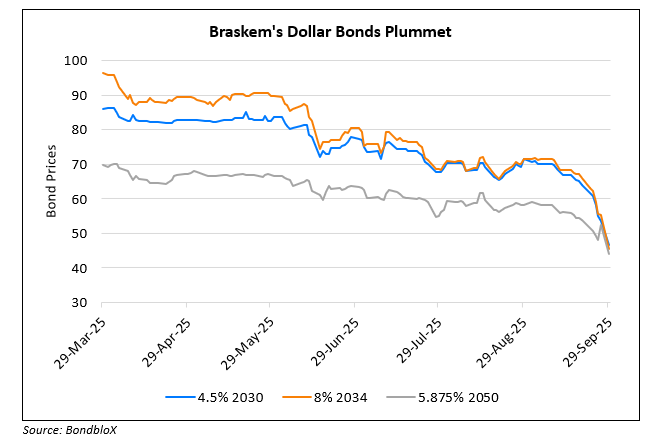 Braskem was downgraded to CCC+ and CCC- from BB- and B+ respectively, by Fitch and S&P. The rating actions came on the back of increased credit and liquidity risk, cash burn, bond amortization pressures coming due in 2028, and a potential debt restructuring process. Braskem’s net leverage is expected to remain elevated, exceeding 10x in 2025 and 2026. Fitch adds that alongside the Alagoas project related cash outflows, Braskem is likely to have a lessened liquidity headroom. As of end-June, Braskem had a cash position of BRL 9.3bn ($1.7bn) and a revolving credit facility equivalent to about BRL 5.5bn ($1bn) available until December 2026. However, S&P believes that it might be difficult for the company to renew the RCF with similar terms. As per sources, the company is said to be in talks to renew the RCF. Braskem’s creditors also said to have approached Moelis & Co. and Houlihan Lokey with a possibility of having restructuring talks. In a filing on Friday, Braskem hired advisers to prepare a “diagnosis of economic and financial alternatives to optimize its capital structure”.