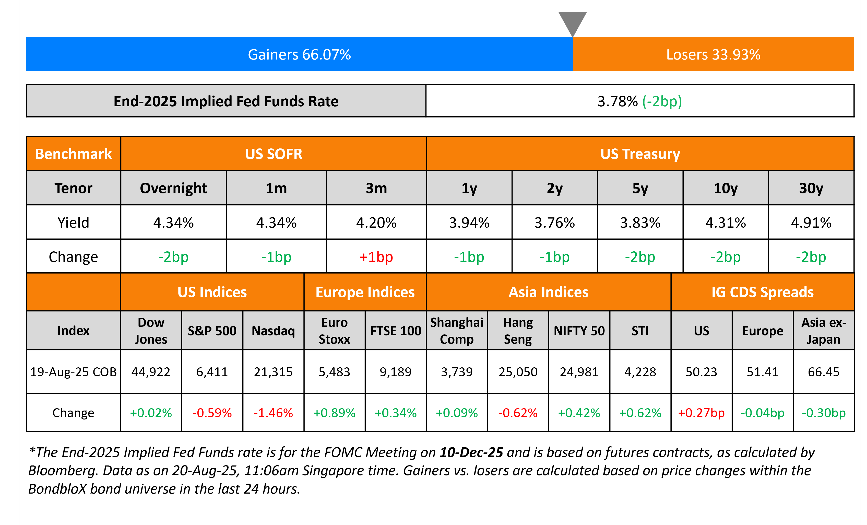 US Treasury yields ended marginally lower by 1-2bp across the board on Tuesday. The preliminary S&P PMIs are due later today, followed by the FOMC’s July meeting minutes. Markets are pricing in ~55bp in Fed rate cuts this year, with the probability of 25bp rate cut in September currently at 85%.