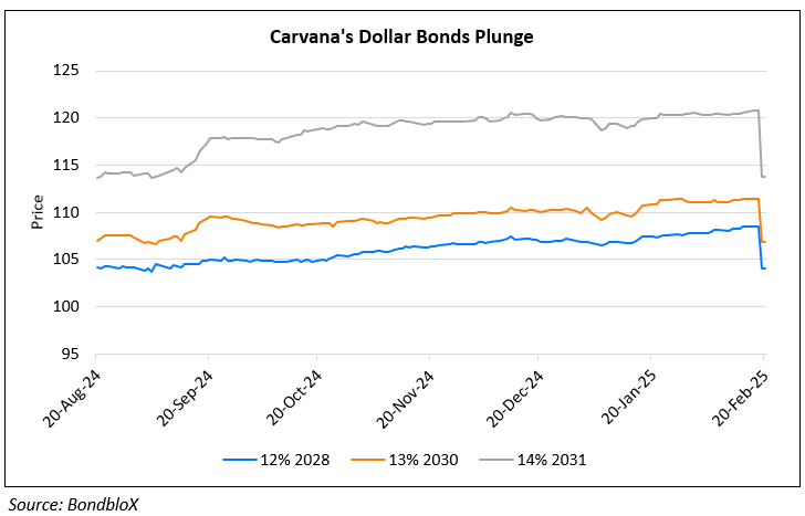 Carvana’s dollar bonds plunged by 4-7 points after the company reported a decline in gross profit per vehicle and a reduction in wholesale volumes for the latest quarter. Despite these issues, Carvana posted strong Q4 results, exceeding revenue and profit expectations. The company posted revenue of $3.55bn, up 32% YoY, surpassing the $3.34bn estimate, though slightly lower than 3Q’s number of $3.66bn. Carvana also reported earnings per share of $0.56, beating the $0.31 estimate, and adjusted EBITDA of $359mn, above the expected $329.4mn. However, revenue per vehicle fell by $1,000 to just over $22,000, and retail gross profit per unit dropped by $270. Wholesale gross profit per vehicle also missed forecasts. The company projected stronger sales volumes and earnings for this year, but the weakness at both the retail and wholesale levels raised concerns about lower-margin growth. Carvana’s stock pulled back by up to 10% in after-hours trading, after hitting a new 52-week high earlier in the day. Its dollar bonds also plunged as shown in the chart above.