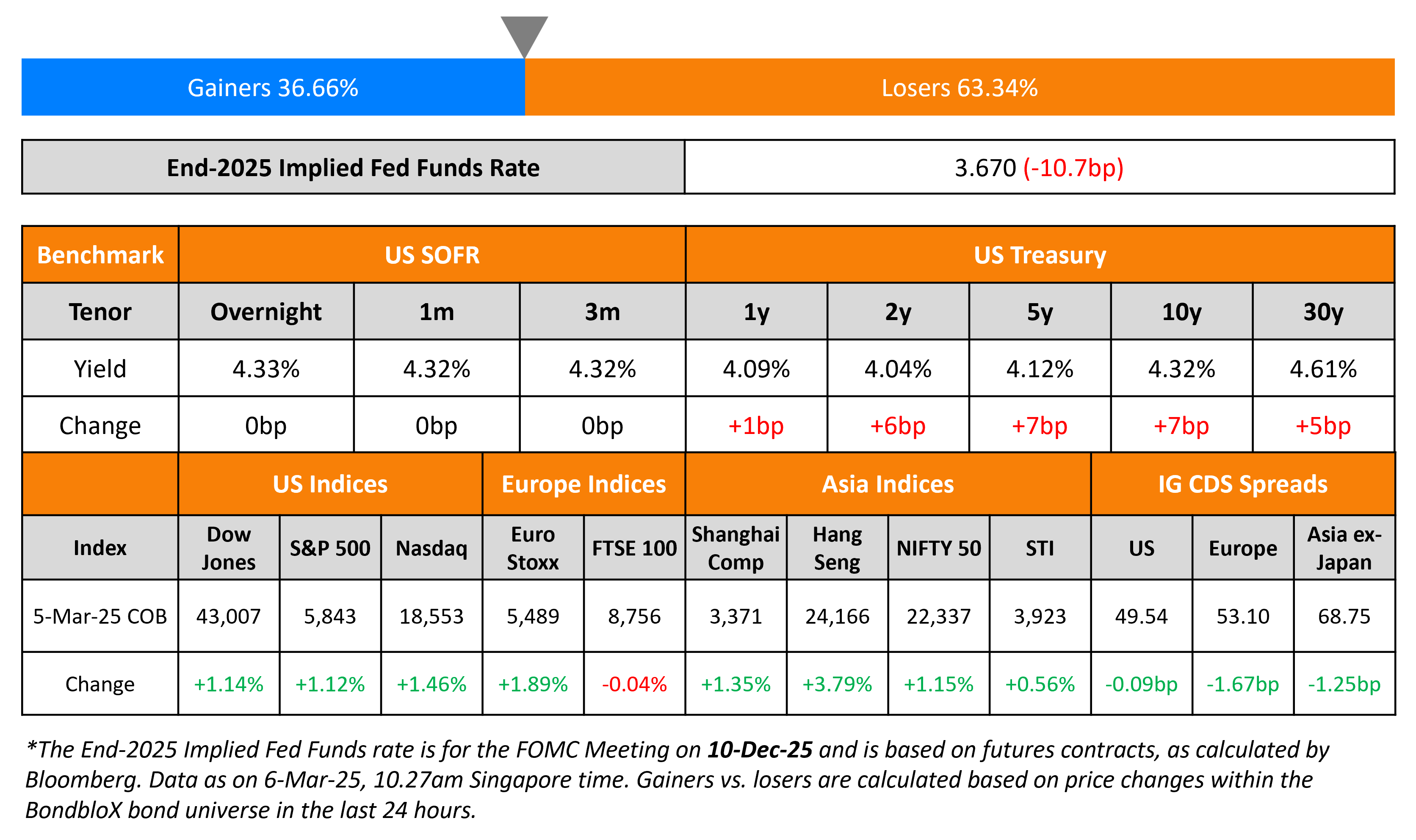 US equity markets saw the S&P and Nasdaq end higher by 1.1% and 1.5% respectively. Looking at credit markets, US IG and HY spreads CDS spreads tightened 0.1bp and 2bp respectively. European equity markets ended broadly higher. The German bund yield continued to rise after a spike of nearly 30bp after reports that potential future German Chancellor Friedrich Merz is set to overhaul Germany’s borrowing rules for infrastructure and military spending. The iTraxx Main and Crossover CDS spreads tightened by 1.7bp and 4.4bp respectively. Asian equity markets have opened in the green this morning. Asia ex-Japan CDS spreads were tighter by 1.3bp.