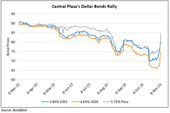 Central Plaza’s dollar bonds have jumped by over 9 points this week. While there was no specific news observed regarding the company, this comes at a time when China has indicated increased support to companies. In a high-level financial meeting in late-October, China signaled support for property developers and resolving local government debt problems. In recent months restrictions have been eased on home purchases and supporting developers in finishing construction of apartments sold ahead of completion. Central Plaza’s 5.75% Perp jumped by 6.7 points to 84.5 cents on the dollar, yielding 23.9%.