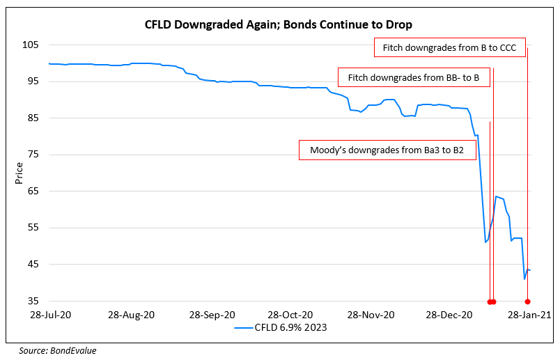 Fitch believes increasing uncertainty over CFLD’s access to financing and difficult capital market conditions will expose it to excessive refinancing risks in the near term. They note that CFLD relies heavily on non-bank financing which consists of ~25% of their outstanding debt. Deterioration in any of its short-term debt conditions may have ripple effects on its long-term debt and hurt liquidity. CFLD has sizeable short-term maturities beginning with a $530mn outstanding 8.625% bond due Feb 28 and CNY 27bn ($4.2bn) through 1H2021 and another CNY 10bn ($1.5bn) in 2H2021. CFLD’s cash to short-term debt coverage was at only 0.3x at end-3Q2020. Lack of visibility on addressing short-term maturities also called for the downgrade. CFLD’s leverage as measured by net debt/adjusted inventory plus receivables was at 68% at end-3Q2020. CFLD was also downgraded by Moody’s earlier this month by two notches to B2 and on review for a possible further downgrade. The news also comes after the bonds took a beating on restructuring related news.