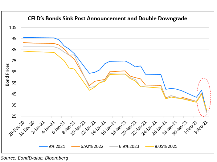 China Fortune Land Development’s (CFLD) has been downgraded two notches to Caa1 from B2 by Moody’s and another notch to CC by Fitch. This is the second downgrade in a week by Fitch after they did a two notch downgrade to CCC last week. CFLD announced yesterday that they missed over CNY5.2bn ($800mn) in payments on its onshore bank and trust loans on Tuesday. A creditor committee has been set up to try to resolve debt obligations and maturities due. Fitch’s downgrade comes after the announcement by CFLD and noted that while the property developer has not missed any capital market debt payments, they will face significant refinancing risks with its $530mn 8.625% 2021s. Besides reasons similar to their downgrade drivers last week, they added that from 4Q20 till the announcement, its net cash outflow excluding shareholders’ support was CNY 37.1bn ($5.7bn) after taking into account debt maturities of CNY 55.9bn ($8.65bn). Unrestricted cash balance was at CNY 800mn ($123.8mn) as of 31 January 2021, while restricted cash amounted to CNY 22.8bn ($3.5bn). Fitch believes CFLD’s unrestricted cash is insufficient to service its upcoming debt due within the next year, ‘in the absence of extraordinary intervention from a third party.’