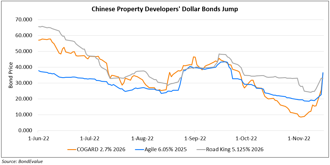 Chinese property developers saw their stocks and bonds rally on Monday following Beijing’s new 16-point relief package for the distressed sector, announced on Friday. Among the names that rallied were Longfor, Country Garden (COGARD), Agile, Central China and Greenland. The upmove was more pronounced for Longfor, which received regulatory approval to issue $2.8bn worth of state-backed debt on Friday – its 3.95% 2029s rose ~17 points to 64.26 cents on the dollar. Adding to the cheer of the relief package, COGARD announced that it is raising HKD 3.9bn ($500mn) via a share placement. The company said that the capital raise, at an 18% discount, will be used for offshore debt repayment, pushing its dollar bonds higher. COGARD’s 2.7% 2026s rose over 20 points over the past two trading sessions to currently trade at 36.35 cents on the dollar.