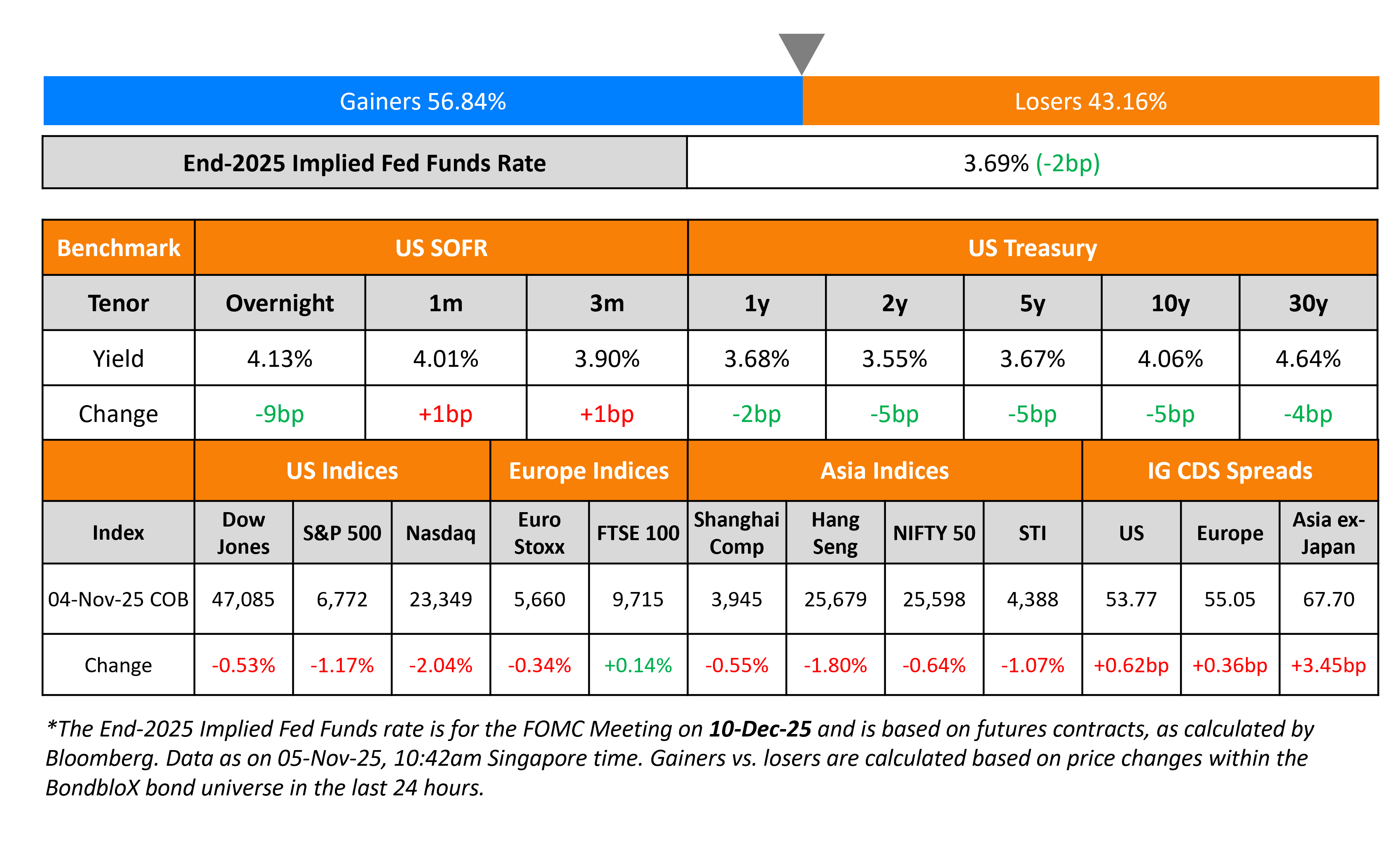 US Treasury yields eased by 4-5bp on Tuesday as the risk sentiment took a backfoot. The move came as equity markets dropped amid several comments by strategists and Wall Street executives regarding potential overvaluation concerns, especially in the technology sector. The Nasdaq fell by over 2% with NVIDIA falling by 4%, Oracle lower by 3.8% amongst others. The Dow and S&P ended lower by 0.5% and 1.2% respectively.