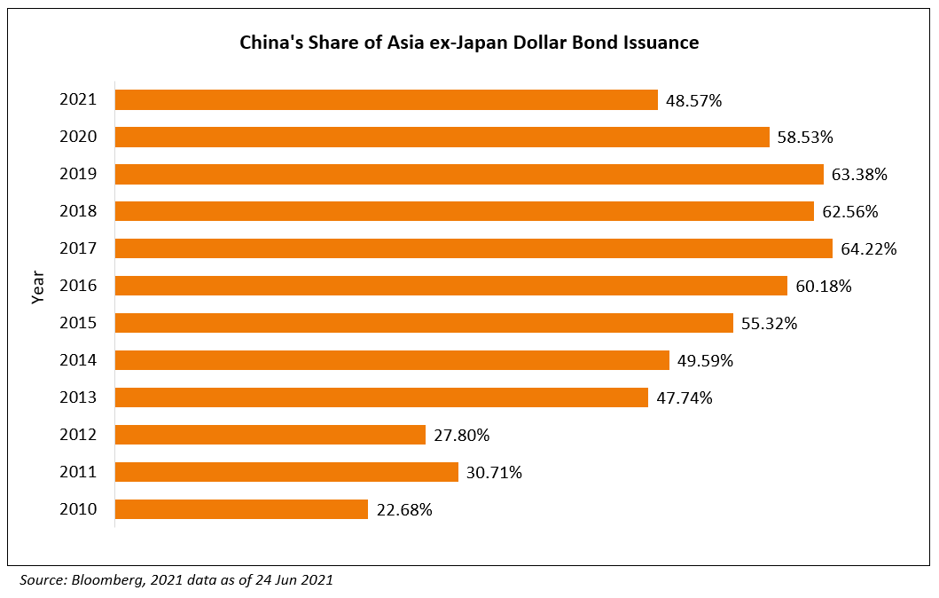 China’s shares of the Asia ex-Japan region’s dollar bond issuances has shrunk to its lowest since 2014 as per Bloomberg. Mainland China issuers have sold $98.1bn in dollar bonds in 2021, less than 50% of the region’s sales this year. Bloomberg adds that the region’s dollar bond sales grew 13%, outpacing China’s issuances and extending a falling trend of market share since 2017 for Chinese issuers. Thu Ha Chow, portfolio manager at Loomis Sayles Investments Asia Pte. says that the government’s three red-lines policy and China Huarong’s financial uncertainty have impacted 2021 dollar-bond issuances from China.