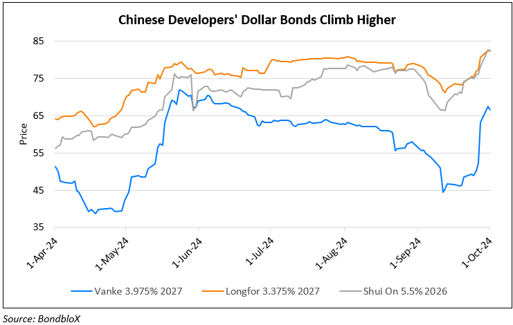 Bonds of Chinese developers including Vanke, Shui On, Longfor continued to march higher after major Chinese cities relaxed home purchase rules. This follows the recent stimulus package announced by Beijing aimed at revitalizing the struggling sector. Guangzhou became the first major city to lift all home purchase restrictions, while Shanghai and Shenzhen announced eased curbs for non-local buyers and reduced down payment requirements to at least 15% for first-time homebuyers. This supportive environment led to rapid sales in major cities, with developers like Shui On Land and Longfor Group quickly selling out new high-end projects. Beijing also relaxed its regulations, allowing non-residents to buy homes in core areas after three years of social insurance or income tax payments, down from five years, and cutting down payment ratios for first and second homes. These changes are set to take effect from 1 October, coinciding with a national holiday. The move by major cities follows a broader government initiative to stabilize the property market, which included lowering mortgage borrowing costs and easing down payment requirements. China’s leaders are increasingly focused on halting the decline in the real estate sector, which has seen new-home prices drop at the fastest rate since 2014. Dollar bonds of Chinese developers have seen almost double digits returns in the past week, as seen in chart above:
