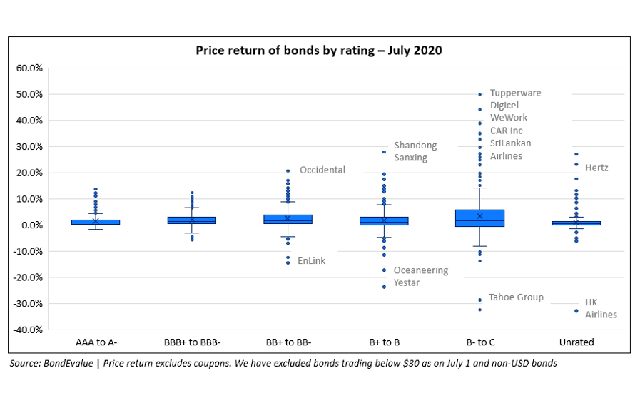 July was a cheerful month for bond investors as 84.2% of all dollar bonds in our universe delivered a positive price return (ex-coupon). This culminated in an unrealized mark-to-market gain of $84bn, calculated by taking a product of the amount outstanding and the July price change for each bond. The box and whisker plot below shows how bonds moved in price terms (ex-coupon) in July by credit rating. The horizontal line inside each of the six boxes indicates the median price return, while the box area above and below it represents the upper and lower quartile respectively. The dots that fall above and below the bounds are outliers with each dot representing a bond.