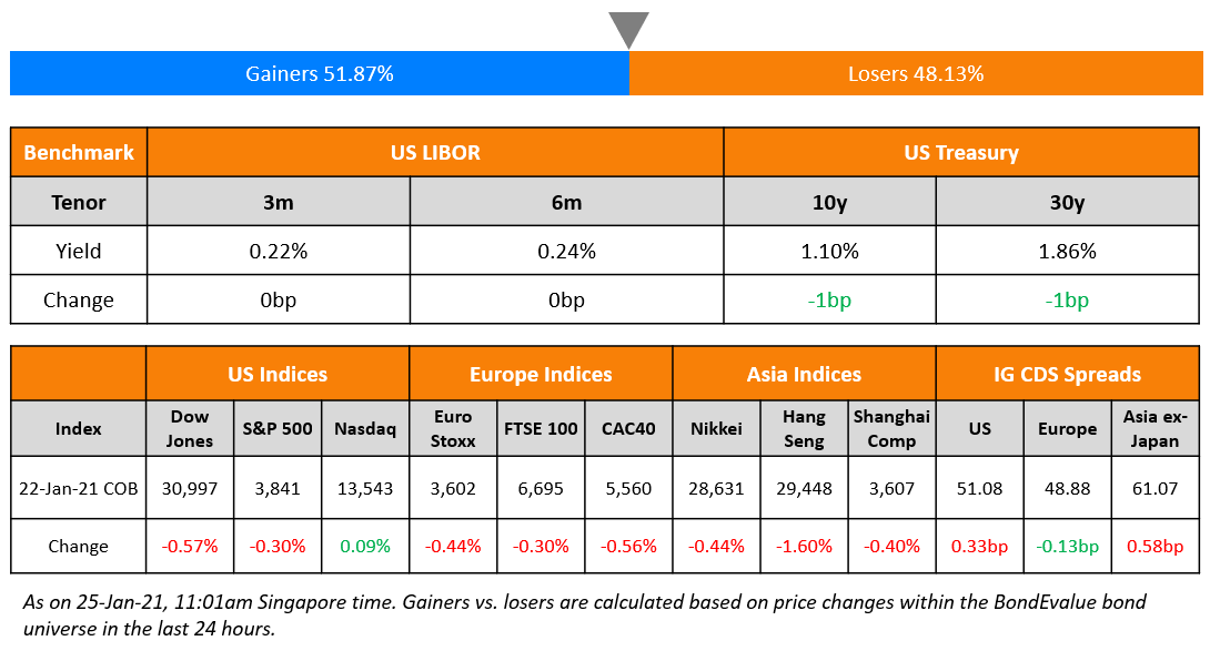 S&P ended Friday lower by 0.3% while Nasdaq was flat. US 10Y Treasury yields moved 1bp lower. Slow vaccine rollouts, fall in oil prices due to build-up in US crude inventories and valuations weighed on markets. “The pandemic seems to continue to expand into a second wave in China, with infections rising by the day and reaching again different regions such as Shanghai” said Rystad Energy oil markets analyst Louise Dickson. European economic data was mixed as UK flash PMIs and retail sales disappointed with sharp misses while German PMIs came in-line with expectations. US IG CDS spreads were 0.33bp wider and HY was 6.3bp wider. EU main CDS spreads tightened 0.1bp while crossover spreads widened 3.8bp. Asia ex-Japan CDS spreads widened 0.6bp and Asian equities have opened mixed today.