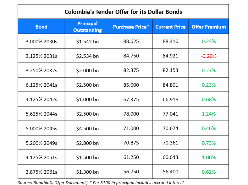 Colombia has launched a cash tender offer to repurchase several series of its outstanding dollar bonds. The sovereign aims to revamp its financing strategy amid concerns about a widening budget deficit. Colombia’s fiscal deficit target for 2026 was recently increased to 2% of GDP vs previous levels of 1.4%, with the overall deficit remaining at 7.1%. The government also aims to tap international markets once in 2025 and twice in 2026, seeking to raise about €5bn. The initiative is designed to lower borrowing costs and reduce the debt-to-GDP ratio, as the government leverages its cash resources for the operation. The offer is not conditioned on any minimum participation and expires on 8th August 2025.