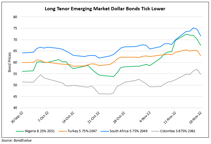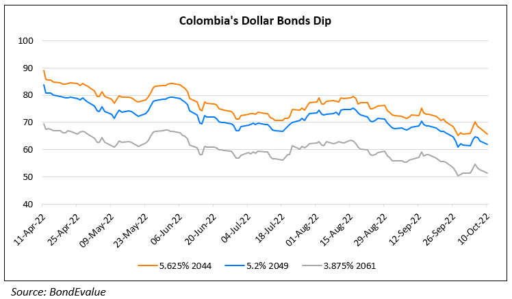Colombia’s dollar bonds traded stable with its 3.875% 2027s at 99.43, yielding 4.24%