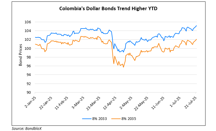 Colombia’s Finance Ministry has been working on a debt management plan to reduce the country’s interest burden. The plan involves repurchasing debt issued in both dollars and local currency. However, officials refrained from providing further details to avoid market speculation. The implementation of the plan is expected to help lower the burden of interest payments and its debt-to-GDP ratio. Colombia plans to offer around €5bn in EUR-denominated bonds over the course of 2025 and 2026. Colombia’s dollar bonds were higher across the board and have been trended higher since April as seen in the chart.