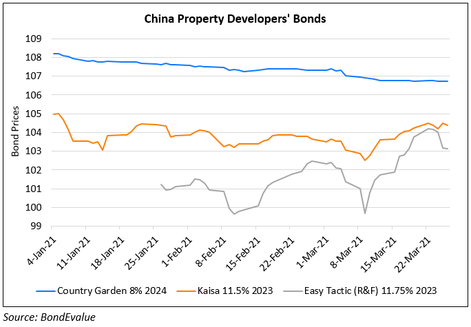 Country Garden’s bonds were flat with its 3.875% 2030s at 100.06, yielding 3.9%. R&F’s bond issued by Easy Tactic was also flat with its 8.625% 2024s at 94.25, yielding 11% while Kaisa’s bonds were stable with its 10.875% Perp at 97.25, yielding 12.2%.