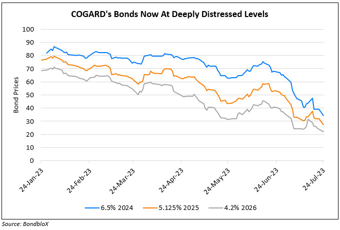Country Garden’s dollar bonds continued to tumble to deeply distressed levels of 20-30 cents on the dollar as fears of a property sector crisis have risen again. While the developer last week refinanced part of a 2019 loan facility, yet analysts and bondholders cite risks that they are not “completely out of the woods”. Raymond Cheng, head of China research at CGS-CIMB Securities notes that COGARD is among the largest developers in terms of sales and any signs of default would not just wreak havoc in the sector, but also send a signal that the government “does not care (about) more developers going down and has no plan to bail out”. With the property sector facing $12.8bn in dollar-denominated repayments by end-2023. COGARD’s immediate repayments include coupons on its 4.8% 2030s and 4.2% 2026s due on August 6. Its next principal repayment is its $1bn 8% dollar bond due January 2024. With erstwhile high-rated developers like Shimao going into default and Wanda on the brink, COGARD is now on the radar. JPMorgan estimates another $9bn of defaults this year, but that does not include COGARD. Its analysts however mention that fresh government support would become crucial to the sector.